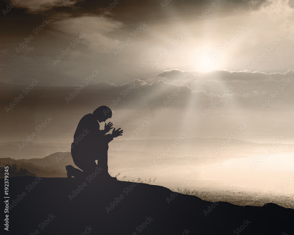 Prayer Kneeling And Praying To God On Mountain Autumn Sunset Background Stock Photo Adobe Stock